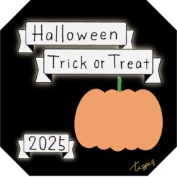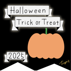 Halloween Happy Trick or Treat 2025のレトロな手描き文字とかぼちゃのイラストとリボンのあしらいのバナー素材600×600pix(デザイン.13