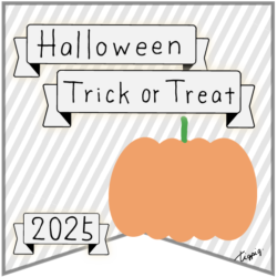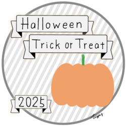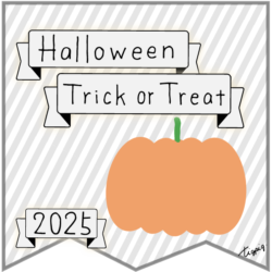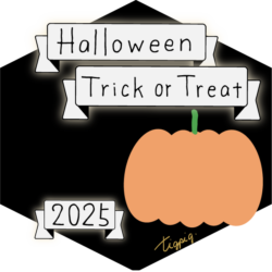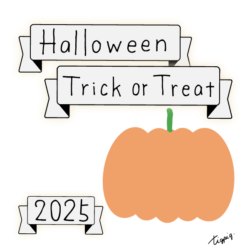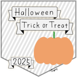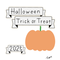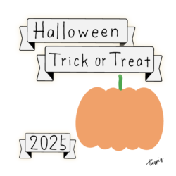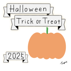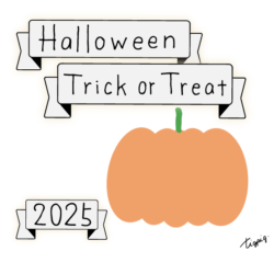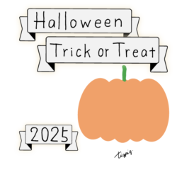 [ハロウィン]Halloween Happy Trick or Treat 2025のレトロな手描き文字とかぼちゃのイラストとリボンのあしらいのバナー素材600×600pix(デザイン.20)