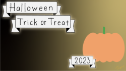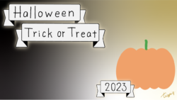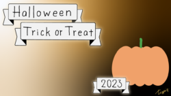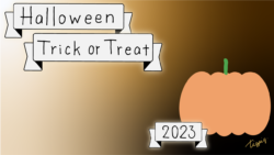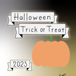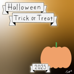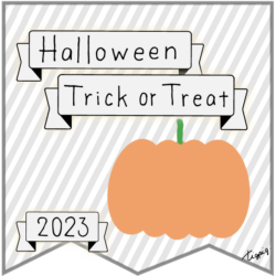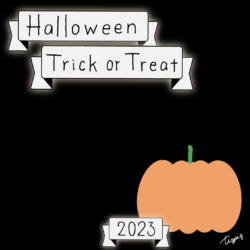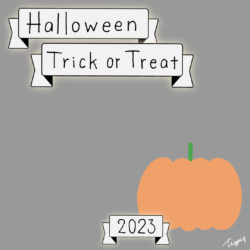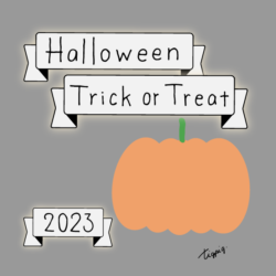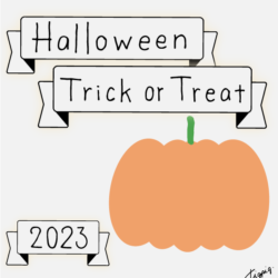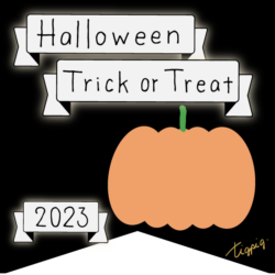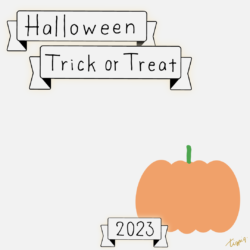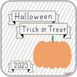 2023 [ハロウィン]Halloween Happy Trick or Treat 2023のレトロな手描き文字とかぼちゃのイラストとリボンのあしらいのバナー素材600×600pix(デザイン.28)