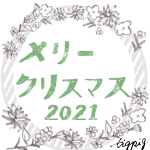 2021 【クリスマス 2021】メリークリスマス(カタカナ)2021の大正レトロ風手書き文字(緑色ver.)とモノトーンのボタニカルの小花と薄灰色のストライプの正方形の枠